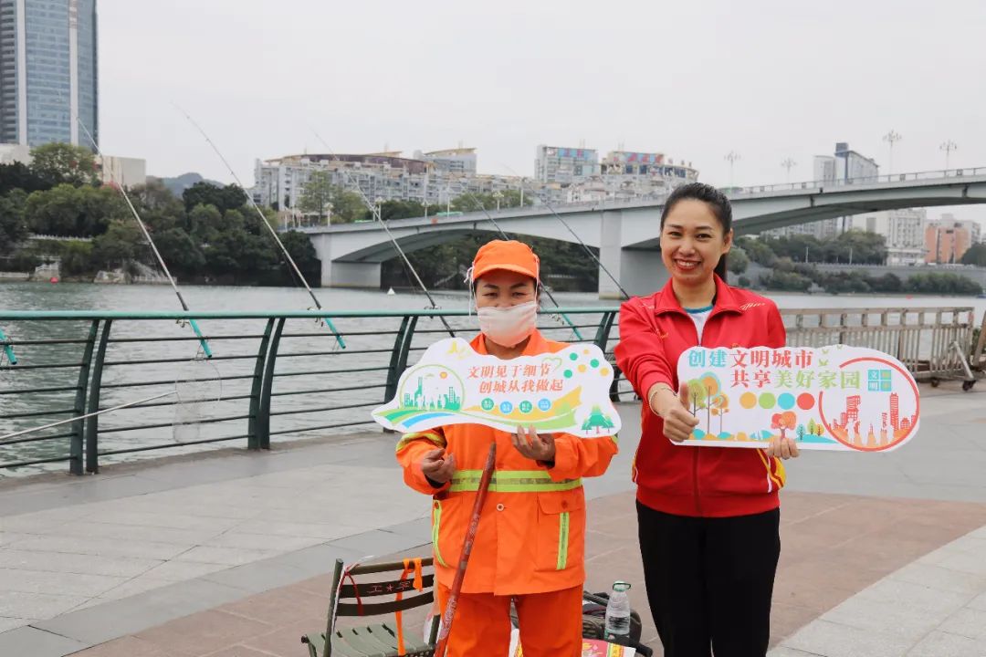 传递文明助力创城。活动中,大家纷纷手持创城标语分头行动,在柳江河畔向过往路人宣传创建文明城市相关知识,共同为柳州创城打CALL,倡导市民身体力行为柳州市争创全国文明城市作出贡献。